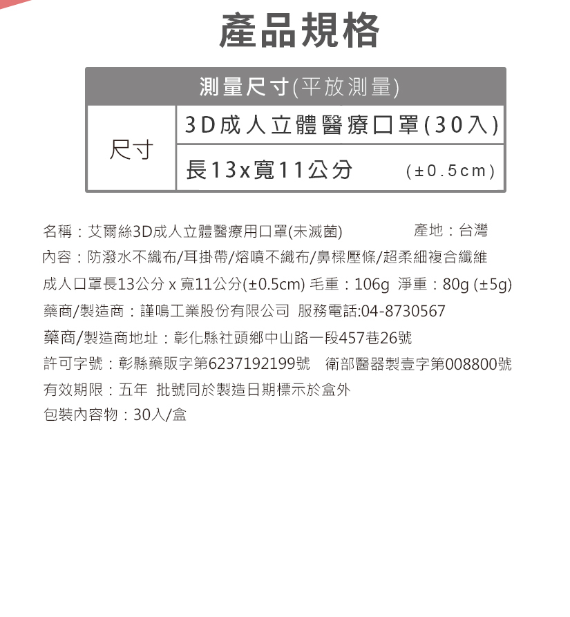 商品名稱:3D艾爾絲立體醫用口罩(未滅菌)