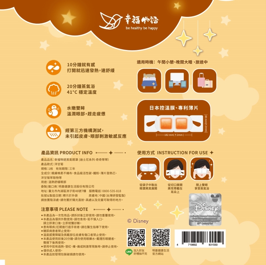 任選4件$319【幸福物語】 奇奇蒂蒂 蒸氣眼罩3片/盒-洋甘菊(單片包裝|迪士尼系列)