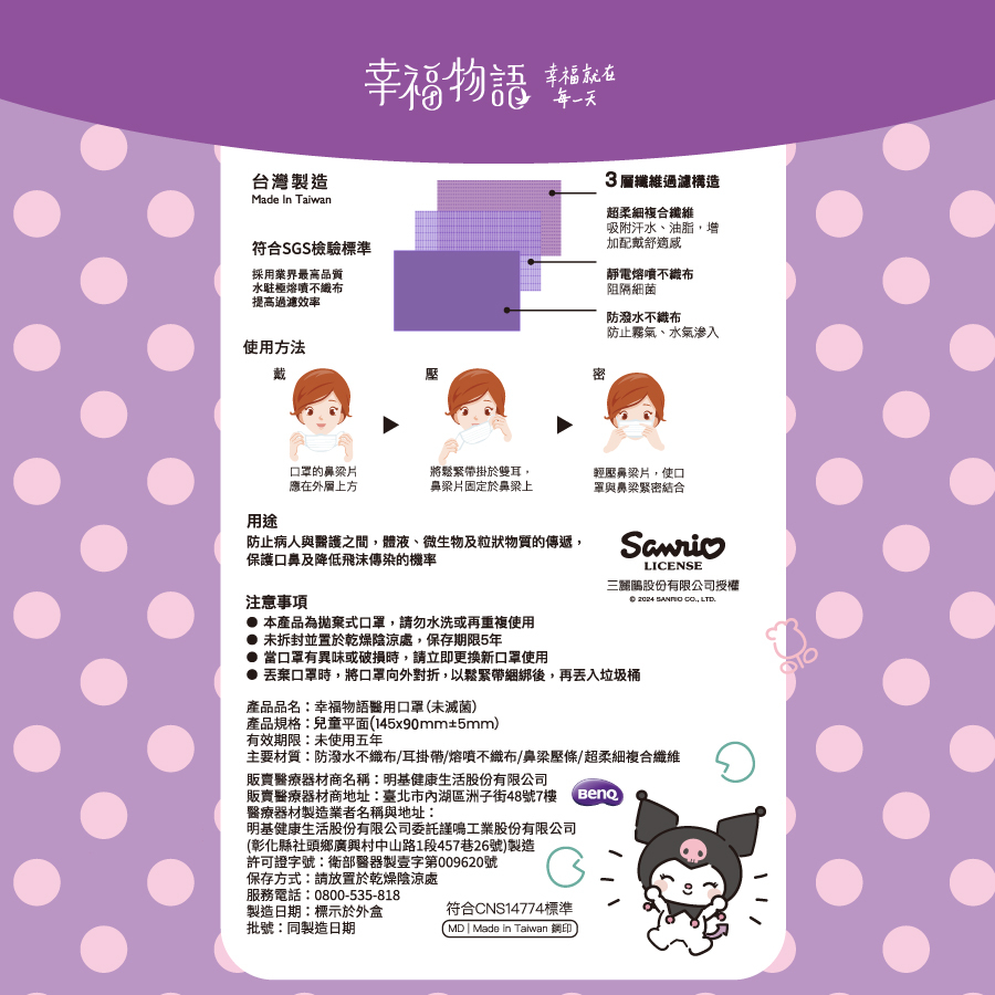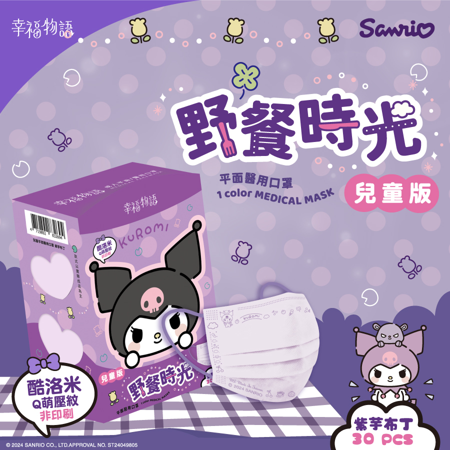 【幸福物語】酷洛米野餐時光 兒童醫療口罩30片/盒(紫芋布丁)